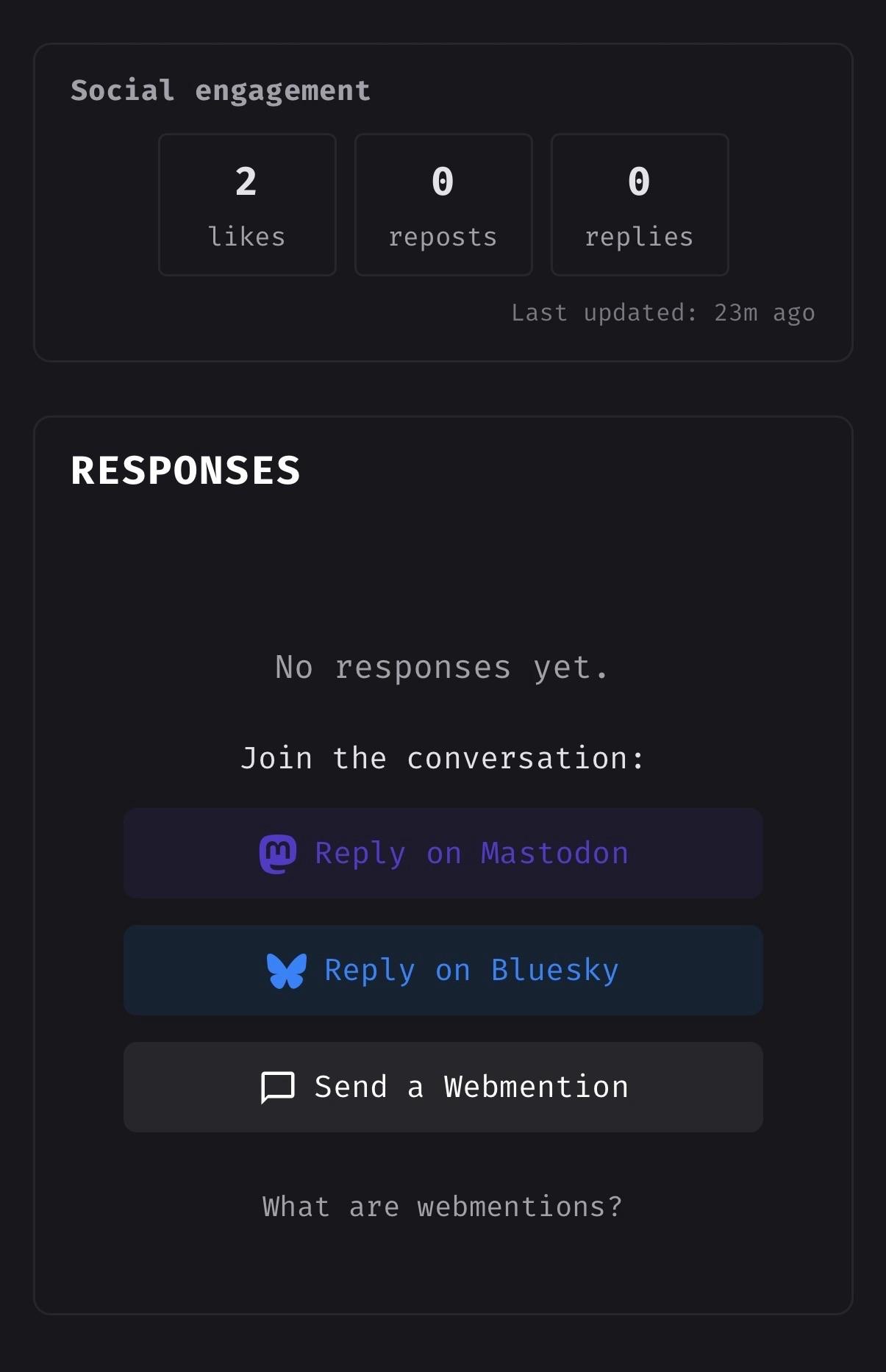 "html": "<p>I built a postroll for my site using Linkding (self-hosted bookmark manager) and Flora (static site generator that <span class=\"h-card\"><a class=\"u-url\" href=\"https://hachyderm.io/@nickv\">@<span>nickv</span></a></span> created).</p><p>It's still a work in progress, but I'm already happier with it than my previous blogroll, which didn't give me enough granularity:</p><p><a href=\"https://kat5.dev/postroll\"><span>https://</span><span>kat5.dev/postroll</span><span></span></a></p><p><a href=\"https://hachyderm.io/tags/indieweb\">#<span>indieweb</span></a></p>\n<a class=\"u-mention\" href=\"https://hachyderm.io/@nickv\"></a>",