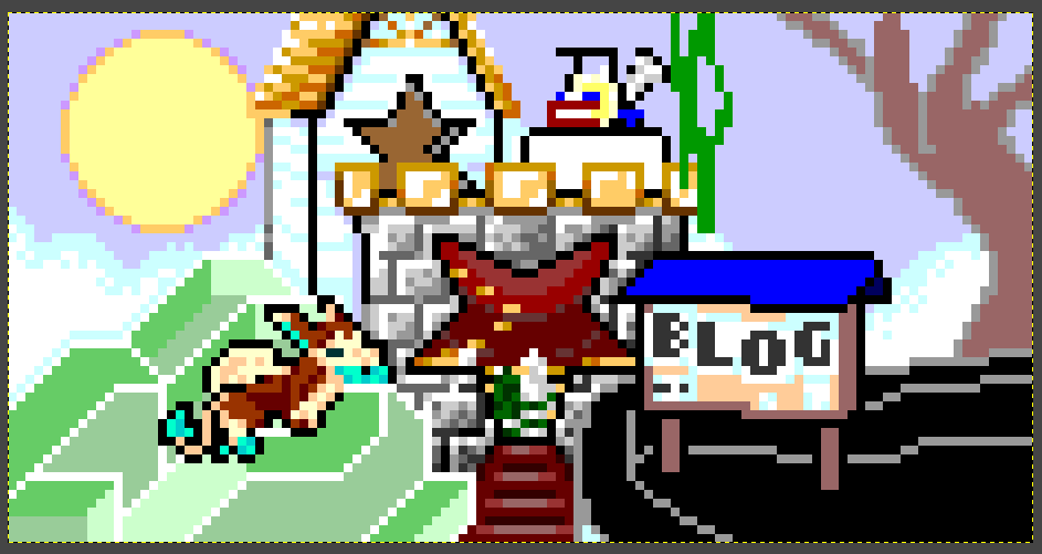 "text": "WIP for a new website home page. I'm scrapping this because it's too visually cluttered. I think I might try drawing the home page with a pencil instead.\n\n#PixelArt #MyArt #NoAI #IndieWeb"