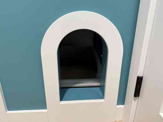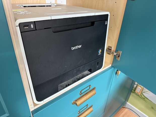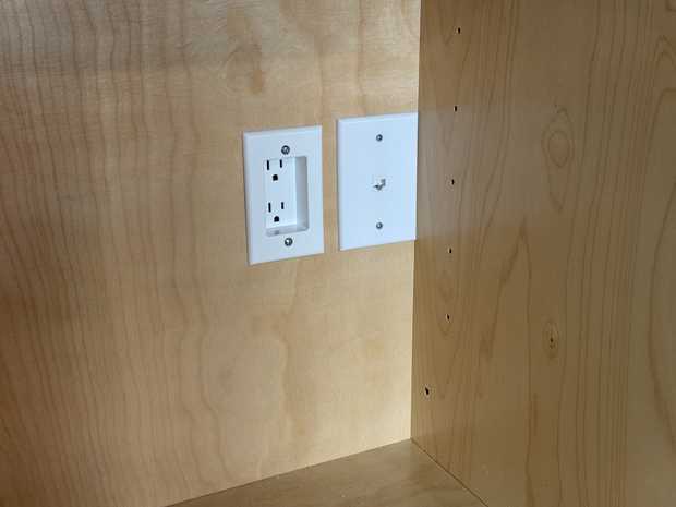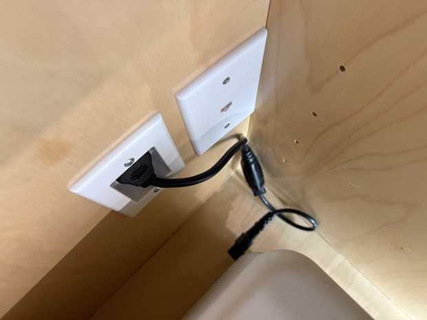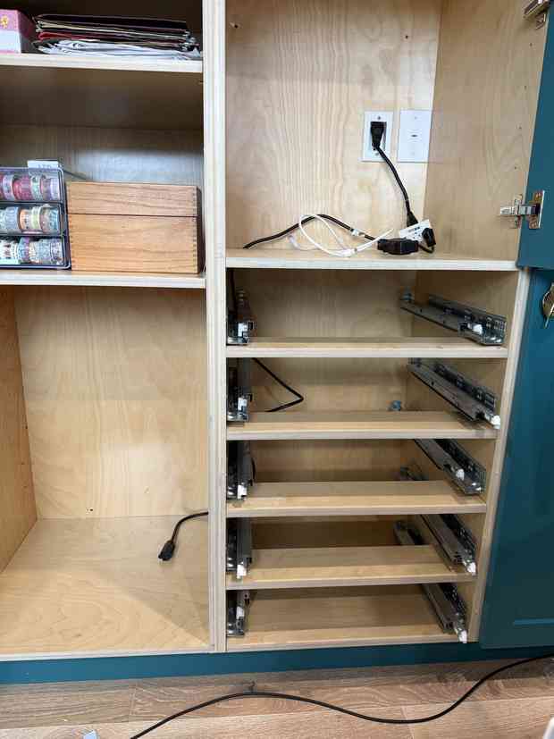 Can't believe we already found somewhere we should have added an outlet. So instead I drilled through the cabinets to run an extension cord from the one outlet we *did* put inside the cabinets, and now there's power for the shredder.