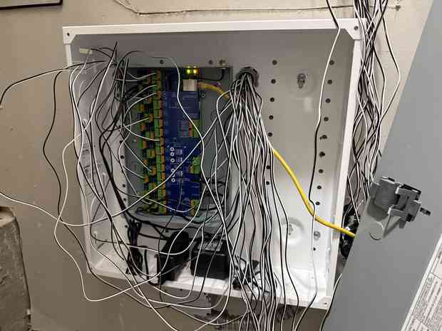 "text": "Opened up the drywall under my electrical panel to make room for the electricians to install a new low voltage box for monitoring the power usage of each circuit!"