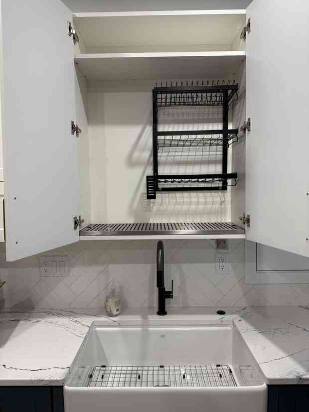 "text": "Best dish rack ever! I finished mounting the tray and built the rack above it. I think I'm still going to add a peg board to the left of the rack in order to be able to hang things from hooks."