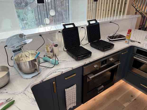 "text": "and *this* is why I added a plug strip along the half wall! Each device's cord is a straight shot to the wall, no messy cords crossing over each other!"