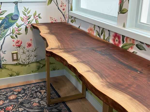 "text": "The live edge desk is done! We put the table legs on it today and moved it into place!"