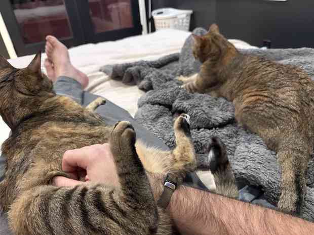"text": "It's moving day for the cats! They are still suspicious but they like hanging out with us on the bed."