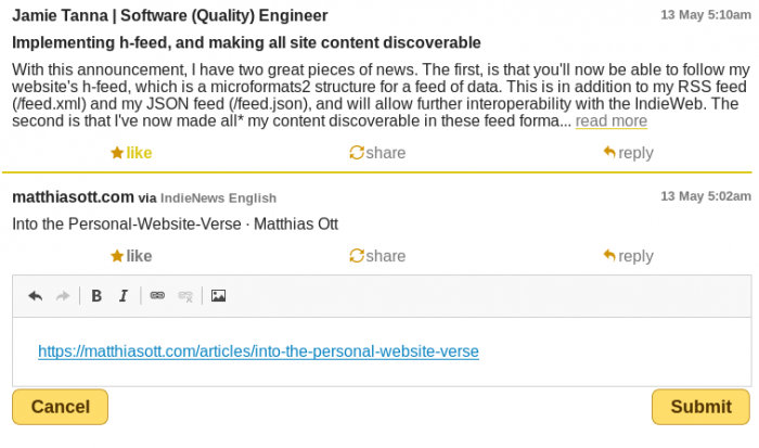 "text": "Moved my reader actions inline... previously clicking an action in the reader would scroll to the top of the page, because that's where the editor was. It would helpfully scroll you back once the interaction was complete, but it was a bit clunky. :-)",
