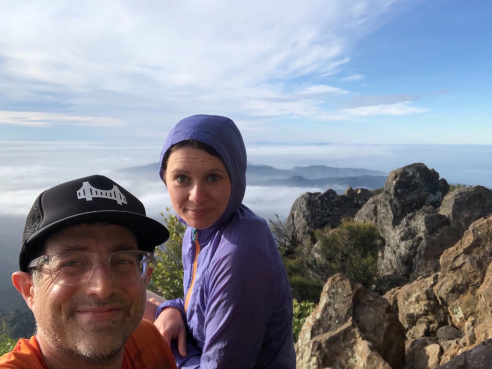 #trailtuesdaythrowback to #running up (and down) Mt. Tam almost two weeks ago with pal Hannah (1). The #trails are not (2) as green as they were two months ago (tantek.com/t4zc1). After an 88:31 climb (tied my 2nd fastest time) to Mt. Tam’s East peak summit, I could barely see the tiny San Francisco skyline poking through a thick fog blanket (3). Looking East the sun was rising far above the horizon, already well on its way at 7:30am (4).