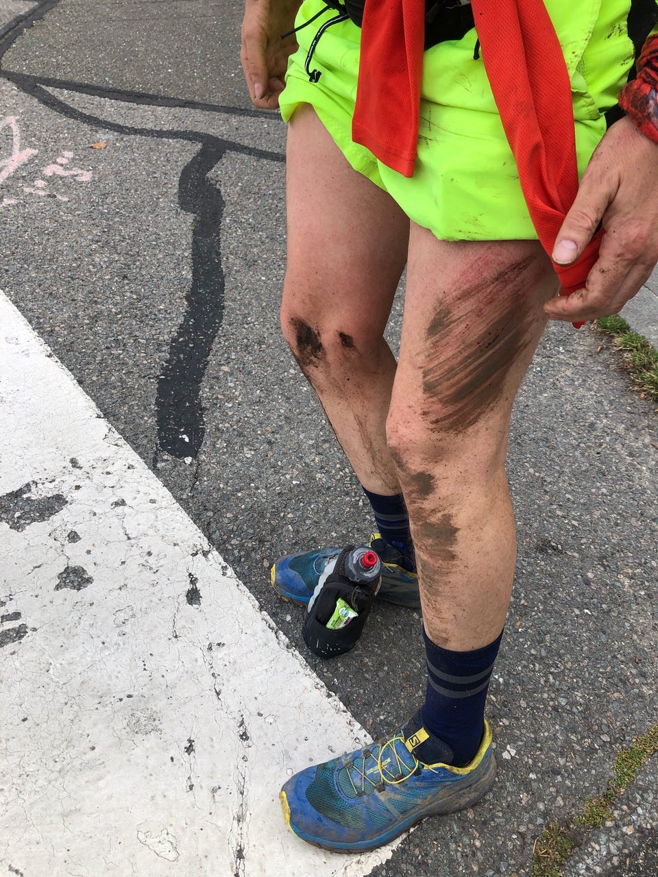 I’d slid ~20-30 feet down into the ravine. Nothing felt broken. I looked down and couldn't really see how far down I’d have to go. Looking back up I pressed against the nearly vertical earth for extra grip while I climbed up one limb at a time, holding on and pressing gently downward with the other three. Made it back up to the trail. Collected myself, scraped most of the mud off my body and water bottle, wiping off the top so I could drink what was left. Another self-inspection, lots of scrapes from left forearm, to thigh, and knee which was bleeding but didn’t hurt. Shock, I’m sure.