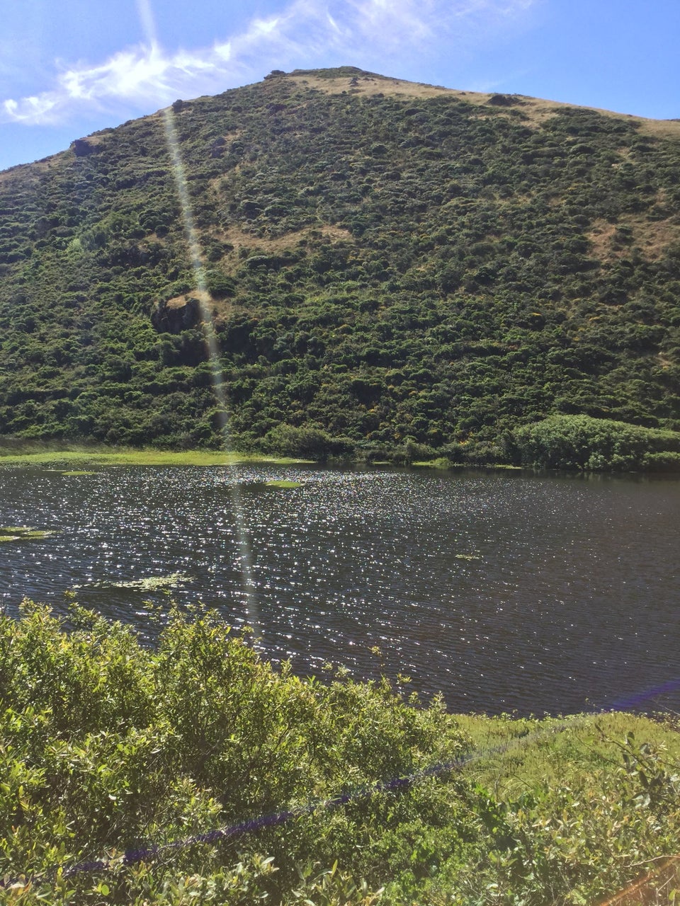 #Running back along the valley trail, I looked back to admire the lagoon ringed by lush greenery, the Pacific in the distance(9). As I turned, the sunlight glistening on the water caught my eye(10).