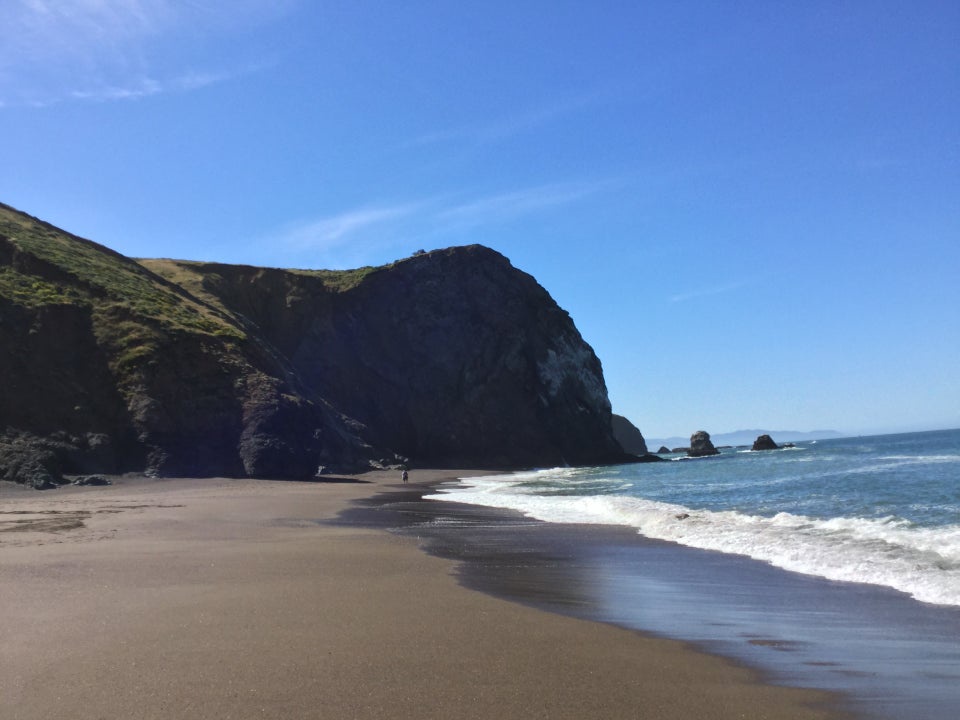 Paused at the Fox and Coastal fork(4), unsure which to take. Drawn to the sea, I ran down Coastal toward the beach. Tennessee Beach was so beautiful, blue sky gradients contrasting the red brown rocks to the north(5), bands of blue ocean and frothy surf to the west(6), rising up the coarse sandy shore(7). There was still a bit of green left on the hills to the south(8).