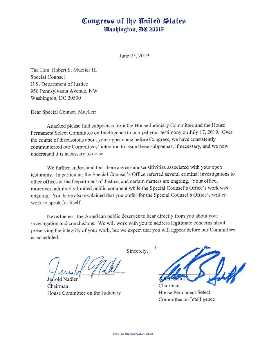 BREAKING: In response to subpoenas, Robert Mueller has agreed to testify publicly before Congress on July 17, House Judiciary and Intel Cmte. chairmen announce.