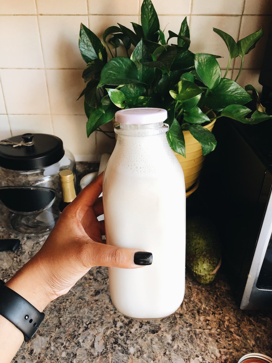 "text": "Homemade cashew milk. \nMade it in under an hour by soaking 1 cup of raw cashews in hot water & proceeding to blend them with 4 cups of fresh water. \ud83d\udc9a",