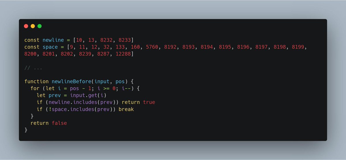 "text": "Wondering if JS engines optimize Array.prototype.includes() in cases of short, constant-length non-changing arrays like this \ud83e\udd14 it certainly makes more sense to leave this to the JIT... /cc @bmeurer @evilpies\n\n(code via @MarijnJH's lezer github.com/lezer-parser/j\u2026 )",
