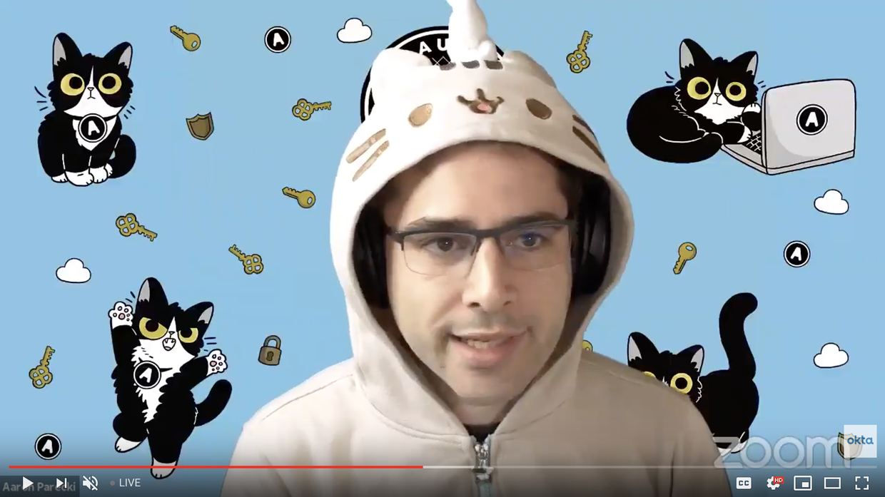 "html": "We are live! and I am dressed as a cat! answering your <a href=\"https://twitter.com/search?q=%23OAuth\">#OAuth</a> and OpenID Connect questions for <a href=\"https://twitter.com/oktadev\">@oktadev</a> haunted office hours!\n\n<a href=\"https://www.youtube.com/watch?v=GeSJa4I8Zew\">youtube.com/watch?v=GeSJa4\u2026</a>"