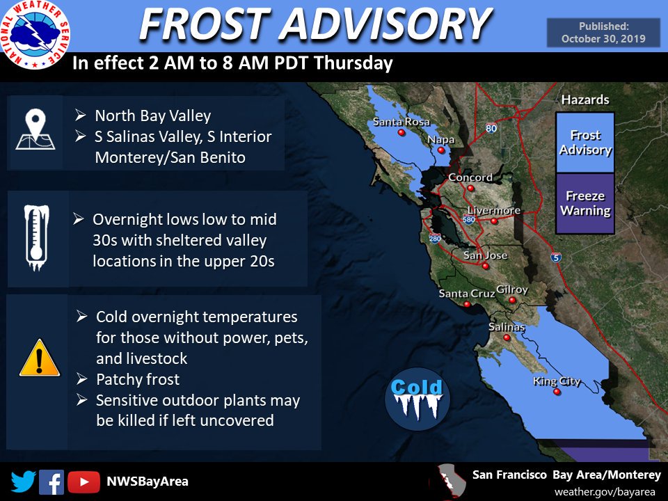 "html": "Frost Advisory has been issued for cold temperatures in the upper 20s to mid 30s Wednesday night into Thursday morning for N Bay Valleys, S Salinas Valley and interior Monterey/San Benito. <a href=\"https://twitter.com/search?q=%23cawx\">#cawx</a>"