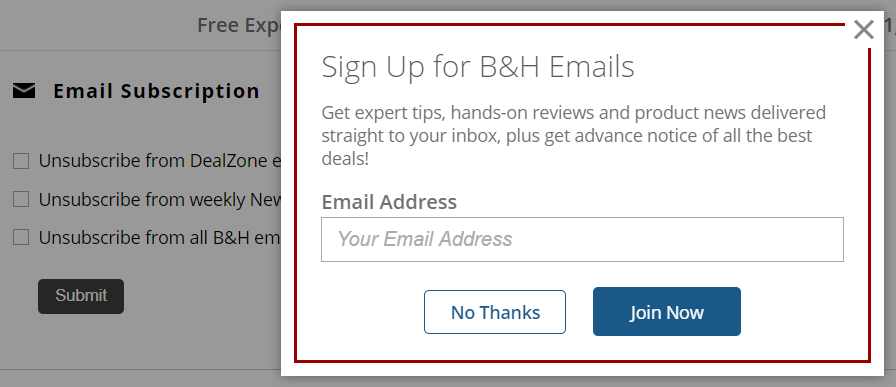 "html": "Maybe don\u2019t have an email subscription popover when I click the unsubscribe link in your email, B&H?"