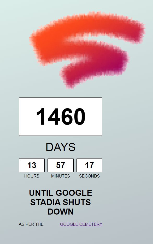 "html": "To celebrate the official launce of Google Stadia (<a href=\"https://twitter.com/GoogleStadia\">@GoogleStadia</a>) tomorrow, I have created a single-purpose website: <a href=\"http://STADIACOUNTDOWN.COM\">STADIACOUNTDOWN.COM</a>. It is a countdown timer set for the average lifespan of any Google service/product, which is 4 years."