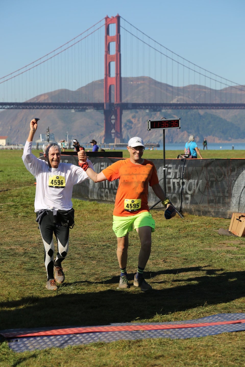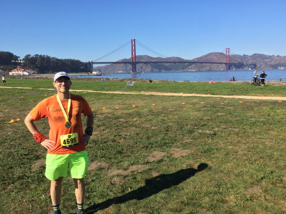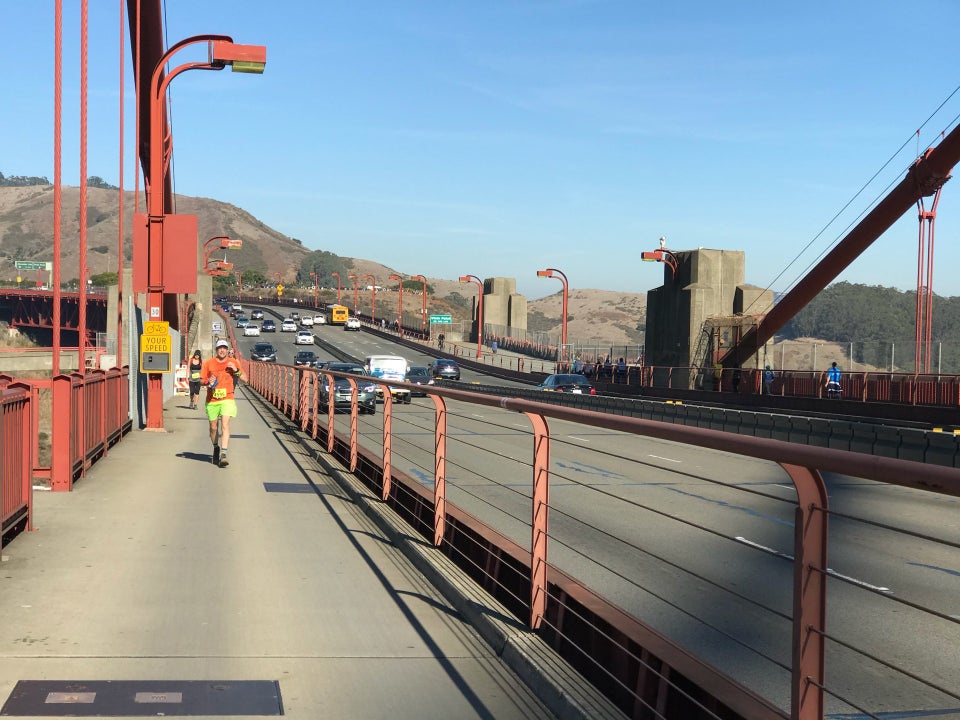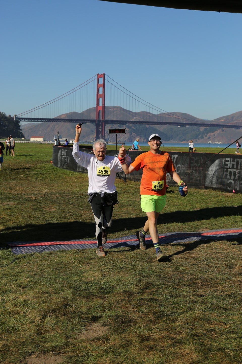 "text": "\ud83c\udfc5\ud83c\udfc5\ud83c\udfc3\ud83c\udffb\u200d\u2642\ufe0f\ud83c\udfc3\ud83c\udffb\u200d\u2642\ufe0fWe did it. 3:22:19 @thenorthfaceECS #TNFECS #ECSCA #halfmarathon #FBF to last #Sunday\n\nDad\u2019s first half marathon #trailrace. My first half the day after a 50k.\n\nClear sky, sunrise start(2). My dad and I jumped into wave 8. We started in the middle of the pack, passed through the arch, and the struggle began. After a brief jog out of the field and part way up the Marin City suburb street, my legs dropped to a walk before even reaching the first trail.\n\nI power-hiked off to the right as best as I could, letting all the eager #runners pass. My dad started to pull ahead. I encouraged him, just reminded him to look behind him every 30 seconds or so and keep me in sight.\n\nPacing dad became chasing dad.\n\nWe reached the Alta Bobcat intersection and saw a friendly group cheering us. One of them recognized me from yesterday, and asked didn\u2019t she see me yesterday, I said yeah I did the 50k, and am pacing my dad today, motioning in front of me with a grin. This seemed to catch her attention, and she ran to catch us.\n\nShe ran up ahead to my dad and asked if she could interview him. He had just taken a photo of me(3). After her interview she ran back to me and introduced herself, Brianna (who I\u2019d later find out was @bri_sacks from LA, mutual friends with pal Vanessa https://instagram.com/justnessinaround/! Small world indeed).\n\nThe race leaders, having finished their down-and-up loop, passed us on the way to the Alta aid station. We reached the shady forest at the top of Alta trail and I almost caught my dad again.\n\nAt the Alta station we topped off our waters, and headed down the moderately steep Rodeo trail. Memories came flashing back from ECSCA 2014 where this very trail was the long downhill of the marathon relay, my first 10k trail race.\n\nPassed a few runners on the way down. Started to close the gap with my dad a few times, yet he kept pulling away. Finally caught him at the second aid station at the bottom of the downhill, and we started power hiking our way up the Bobcat trail.\n\nI hadn\u2019t felt hungry until then, and since this was the last big uphill I tore open a Simple Energy packet and ate it.\n\nFinished our Rodeo Bobcat trails loop, once again hiking up to the top of Alta trail and down through its shady forest. My took another photo of me(4). Topped off my water at the Alta aid station where one of the station volunteers warned us that we were behind pace for the cut-off. \n\nEven though technically we were about 5 minutes behind that cut-off checkpoint, I was a little annoyed at being told (hoping my dad didn\u2019t hear it and get discouraged), as having just ran the mostly downhill subsequent six miles the day before, I knew we would easily make it to the finish before the four hour cut-off.\n\nOnto SCA trail we went. Single-track and a bit rocky, it\u2019s the most technical part of the ECSCA half marathon course. Being more familiar I took the lead and my dad followed, til he caught up to me on the brief uphill where you get a great view of San Francisco, the bridge, the bay, and the 101 Freeway. Back to the rocky descent I started to close in on him again.\n\nA race volunteer directed him down the left turn towards the bridge. I\u2019d almost caught up and he took off down those stairs, opening up a bit of a lead again. This was it, my last chance to actually catch him before the Golden Gate Bridge. I focused as I had the day before and started leaping downward as quickly and deftly I could, passing others in pursuit of my dad who had somehow also picked up speed. Caught him on the last switch back, and we crossed the road together onto the brief bit of trail before the bridge.\n\nApparently there were enough of us running the half marathon that The North Face was able to reserve the West side sidewalk on the bridge just for racers. It was pleasantly warmer than the day before, with a nicer Pacific Ocean view. Once again the concrete path was no fun to run on, so dropped down to a power-walk, swinging my arms forcefully for extra forward momentum. My dad pulled away again, and took another photo(5).\n\nOnly near the end of the bridge did I start running with another racer who wasn\u2019t sure where she was going. We realized we needed to cloverleaf under the bridge back towards the finish. Race volunteers where there to direct us yet again. I had my whistle ready, the warm sun had really brought out the toursts.\n\nNo need to use the whistle, we were able to get past the tourists with some kind requests or yelling out \u201con your left!\u201d. I saw my dad enter the sweeping downhill path toward The Warming Hut. Last chance to catch him, so I pushed extra hard. He paused briefly and whistled for me, seeing me approaching he kept going. By the time he reached the steps I was mere feet behind him. As he hestitated for the tourists, I launched down the steps as I had the day before.\n\nLast chance to build up a lead before he\u2019d catch me again on the flats. At the bottom of the steps, race volunteers were once again stopping traffic so we could crass. Dad caught up to me on the gravel path to the field, and we stuck together for the remainder. Tight right turn from the gravel onto the Crissy field green to the finishing chute. Told my dad to step carefully and look out for the gopher holes.\n\nWith mere yards to go we grabbed hands and raised them up as we crossed the finish line(6) under bright blue skies.\n\nWe finished in 3:22:19 with almost 13 miles, and just over 2000' climbed. Easily beat the four hour time limit. Walk in the park. Like a typical Saturday morning SFRC run. Sore feet but otherwise I felt fine. Nothing else hurt. \n\nMy #50miletraining had begun.\n\n\nEpilogue: Afterwards we walked around, loosening up our legs. My dad grabbed a seat and elevated his legs. I walked a bit more to round up my total distance