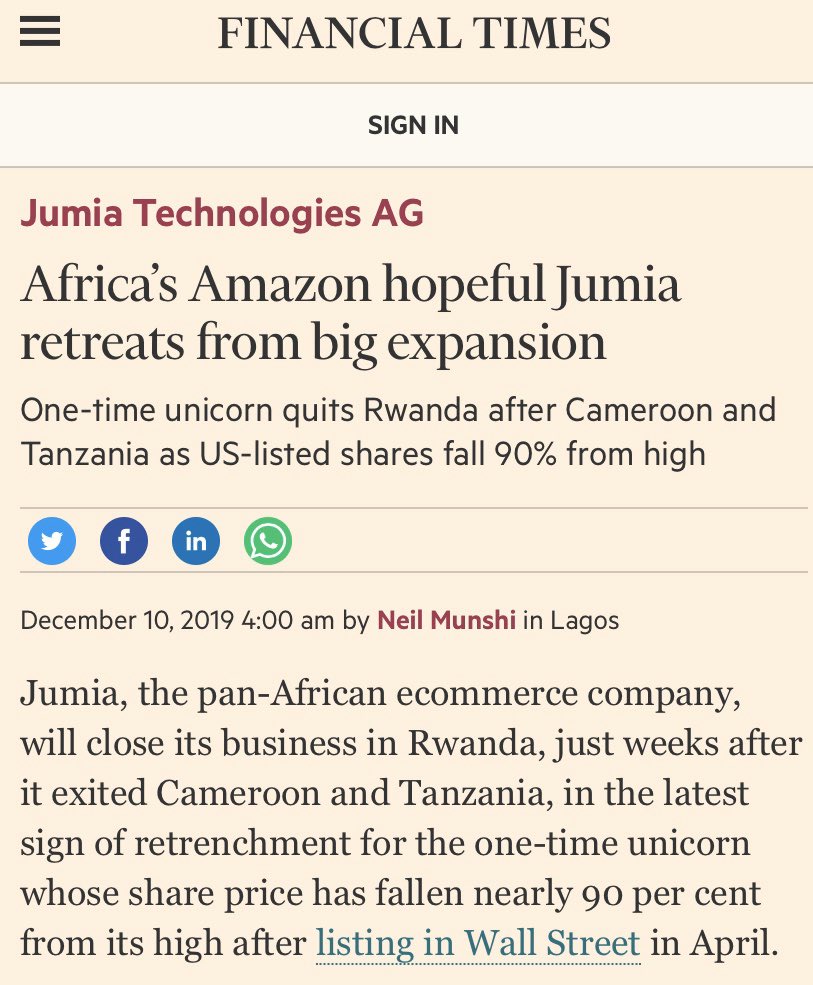 "text": "\u2753With @Jumia_Group shutting down it\u2019s 3rd market in a few weeks, what does that mean for the #eCommerce sector in #Africa? Still an opportunity or should we look at other models?\n\n>> amp.ft.com/content/a4f6ee\u2026",
