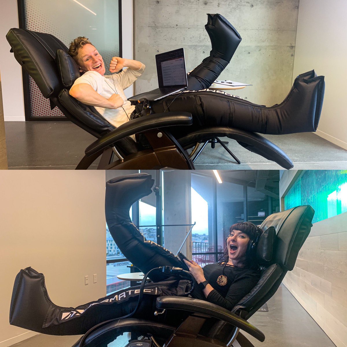 "text": "Just a typical day at the @adobe office. Cass and I got our legs squeezed with the @NTRecovery while coworking.",