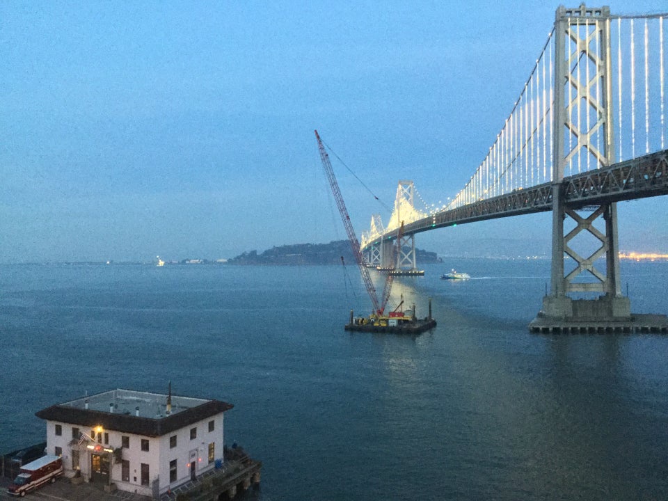 Yesterday, first day in the office this year. Crane on a barge in the bay for some reason and sad to see a layer of smog occluding the East Bay(1). No better in the early evening, could only see lights from Treasure Island and the Port of Oakland(2)… tantek.com/2020/004/t1/fi…