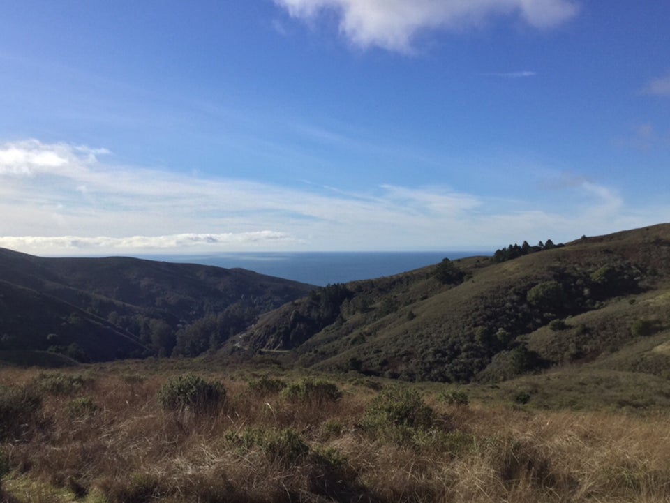 Beautiful day, mostly blue sky, brilliant #sunshine lighting up a clear sky(2). Ran up Fox trail to views of the Pacific Ocean among green Marin hills on either side of Tennessee Valley(1).