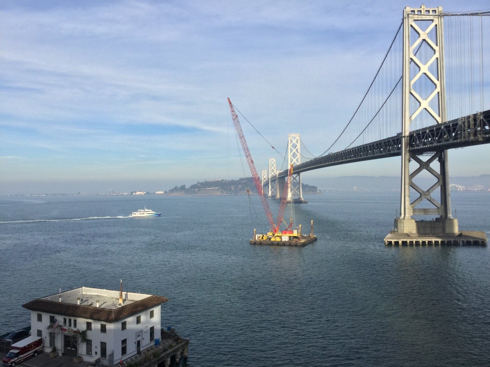 Yesterday, first day in the office this year. Crane on a barge in the bay for some reason and sad to see a layer of smog occluding the East Bay(1). No better in the early evening, could only see lights from Treasure Island and the Port of Oakland(2).