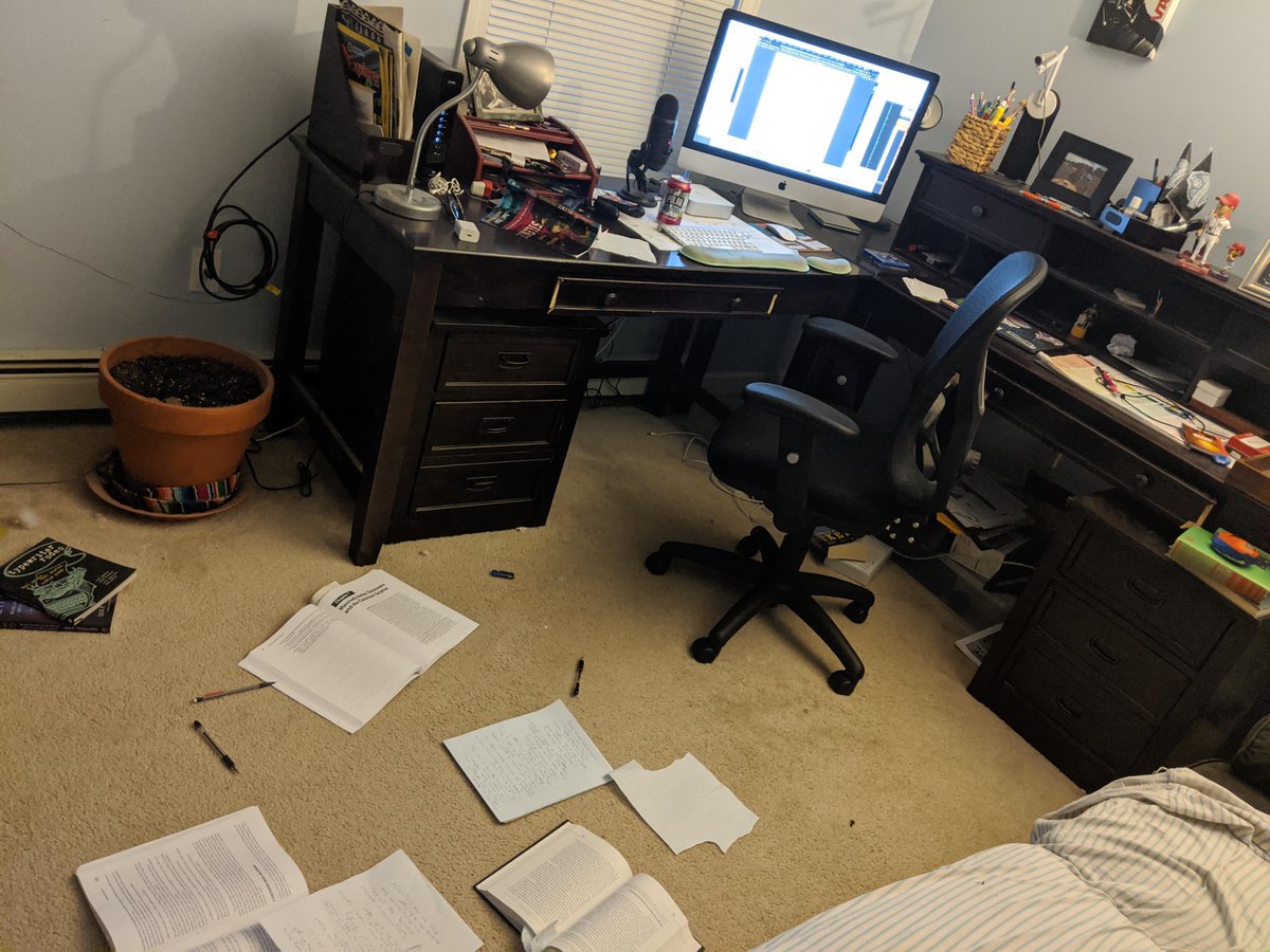 "html": "My Writing Environment, Books sprawled on floor, notes some in scraps others more formalized, <a href=\"https://twitter.com/search?q=%23literacies\">#literacies</a> and study skills are embodied experiences"