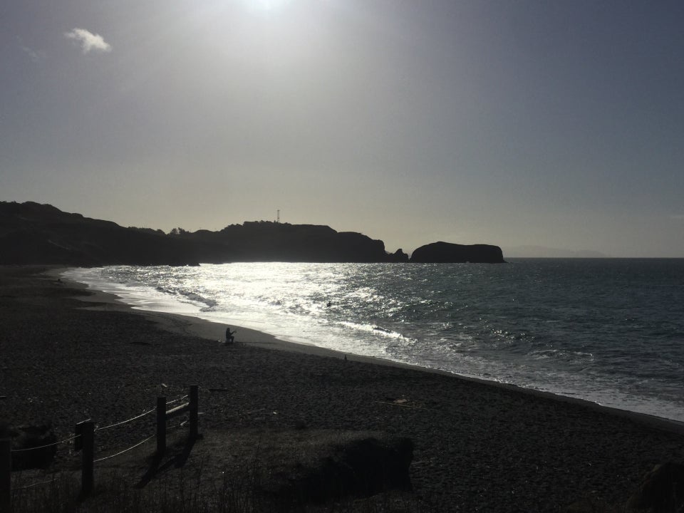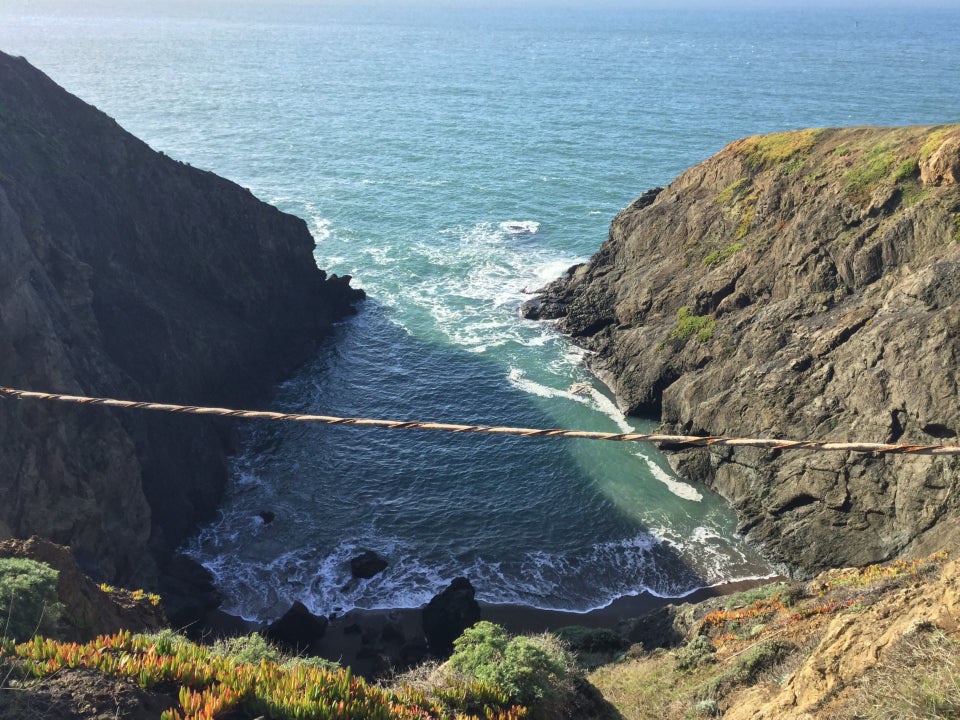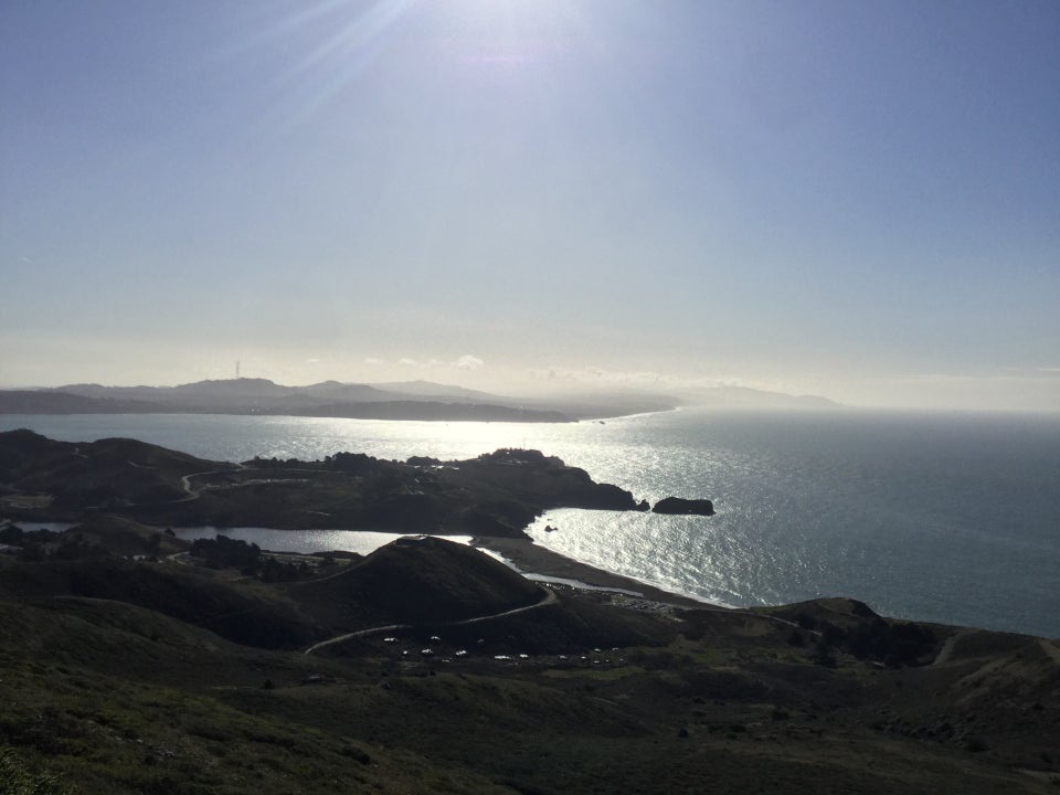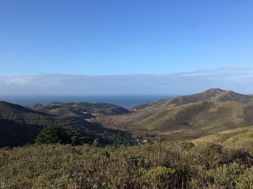 At the peak of Slacker trail, I could just make out Rodeo lagoon, and Rodeo beach(5). Running down to the beach, the sun glistened off the water, backlighting a fisherman and a few surfers(6). On the Coastal trail climb, a seemingly unreachable cove, secluded yet visible from above, with an inviting beach(7). Hiking up to Hill 88, looked back down at Rodeo Beach(8). Returning on Old Springs trail, caught a view of Tenneessee Valley down to the beach(9).