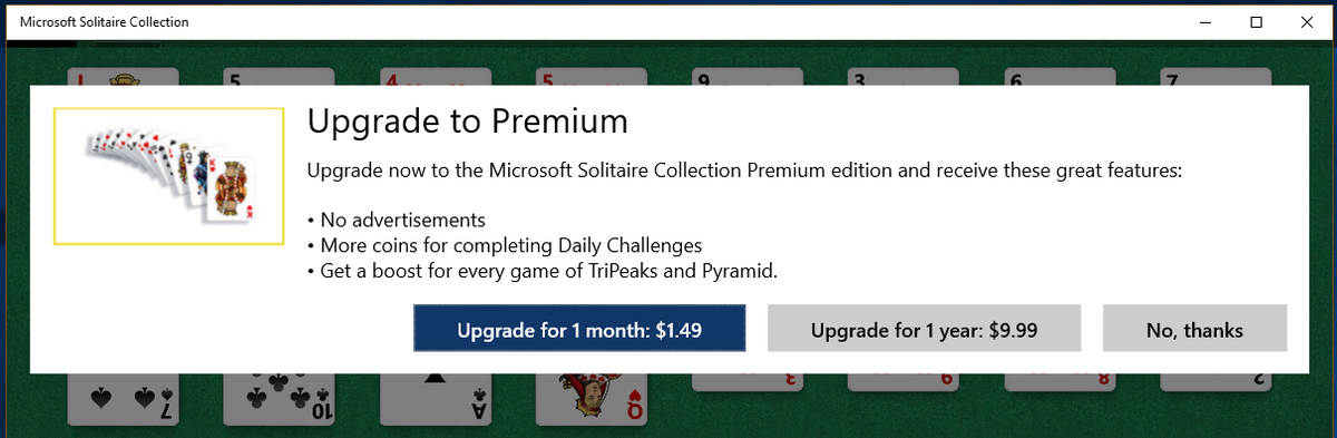 The Solitaire in Windows 10 asks for in-app purchases.