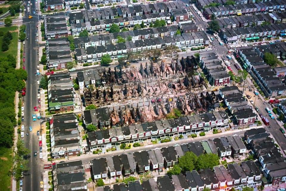 "text": "35 years ago today in 1985 the City of Philadelphia dropped a bomb from a helicopter and destroyed 60+ homes, murdering 11 adults and children. The MOVE bombing is a highly touchy subject in Philly but every time I post about either of the MOVE standoffs at least one person (1/)"