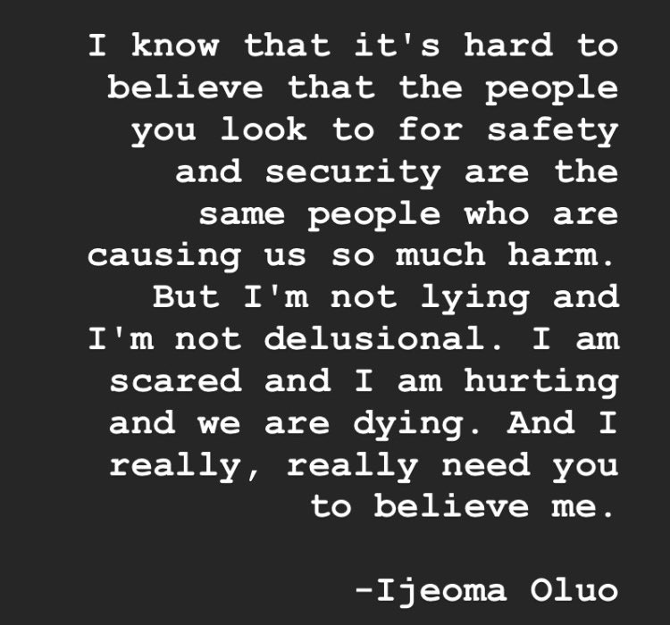“Our police force was not created to serve black Americans; it was created to police black Americans and serve white Americans.” - @IjeomaOluo #BlackLivesMatter