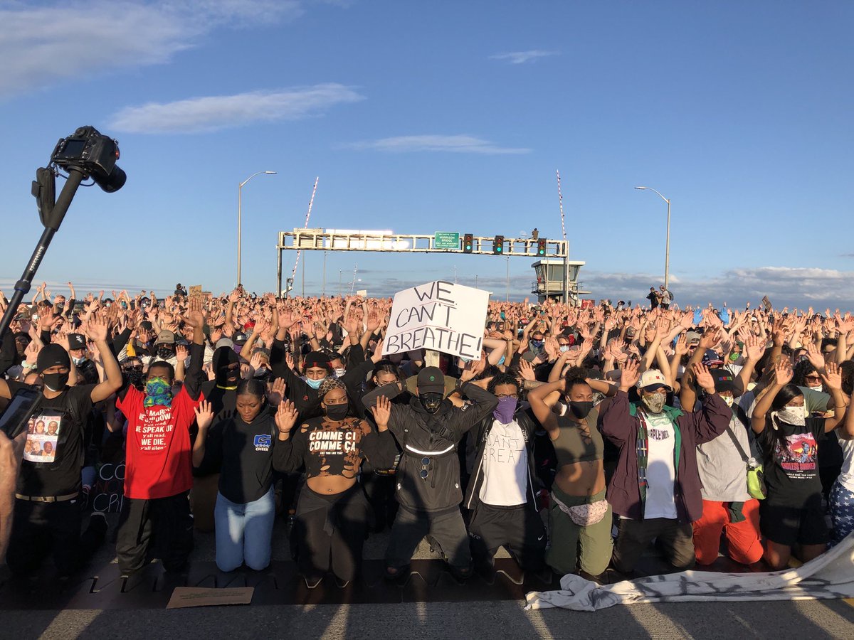 "text": "The entire protest is down on its knees, hands up, filling up the Morrison Bridge."