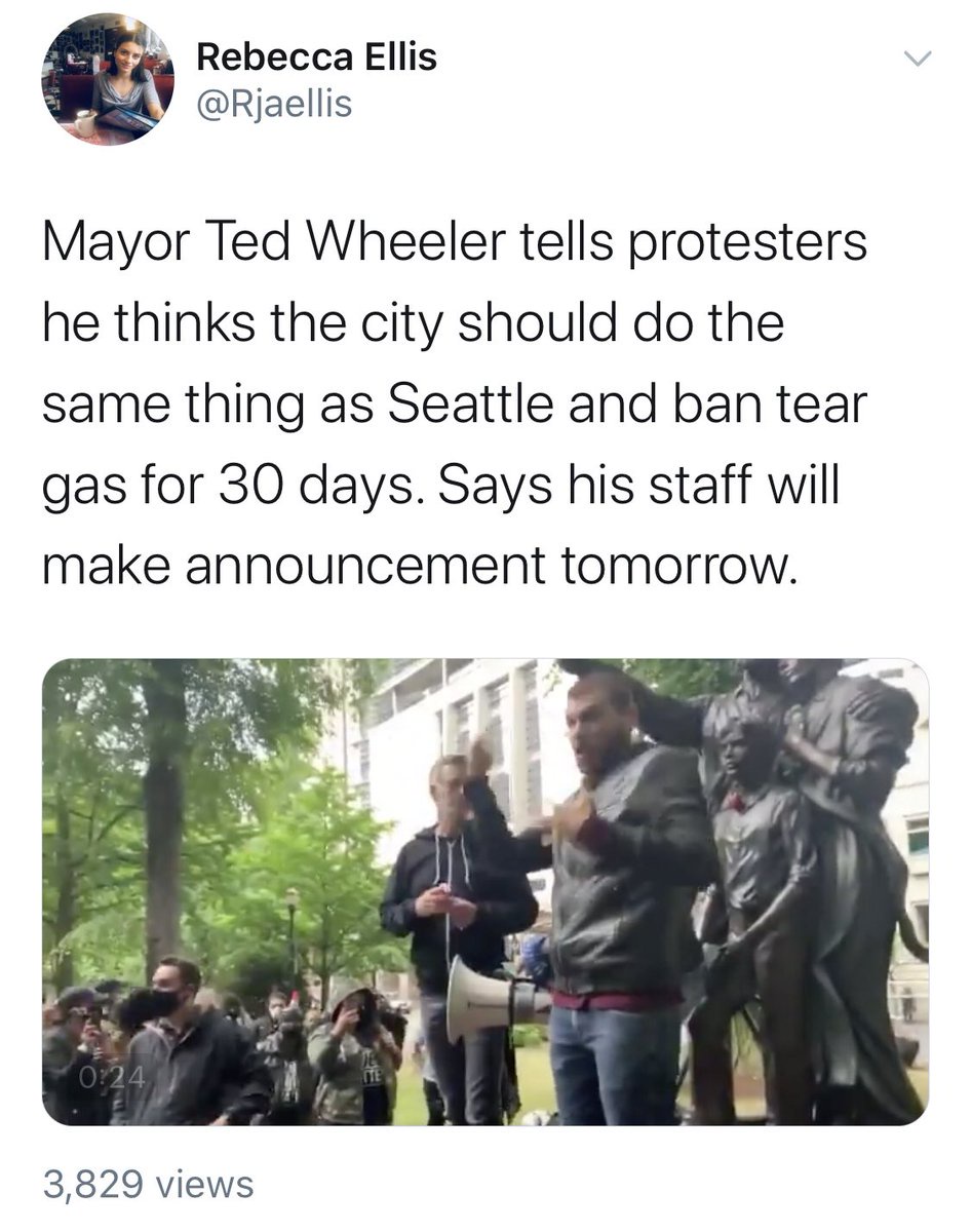 "text": "ICYMI, Wheeler showed up at the protest last night and said he\u2019d consider a temporary ban on tear gas. A couple hours later, his cops told protestors to leave downtown, blocked them in, and tear gassed them."