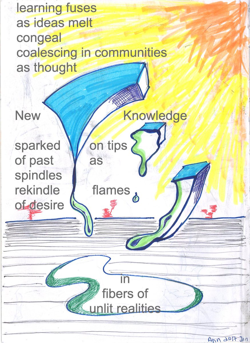 "text": "learning fuses\n\nas ideas melt\n\n congeal\n\ncoalescing in communities\n\nas thought\n\nNew Knowledge\n\nsparked on tips\n\nof past as\n\nspindles\n\nrekindle flames\n\nof desire\n\nfibers of\n\nunlit realities\n#smallpoems",