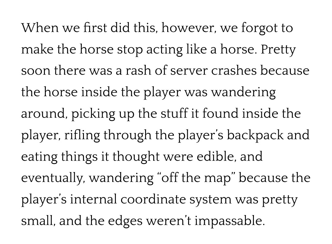 "text": "\u201cWhen you rode a horse, we simply put the horse inside the player, and spawned a pair of pants that looked like your horse\u2026\n\u2026\nWhen we first did this, however, we forgot to make the horse stop acting like a horse.\u201d\n\nI'm ded \ud83d\udc80\ud83e\udd23"