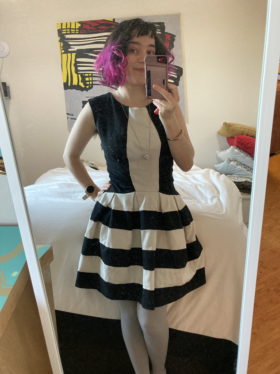 "text": "I have worn this dress \ud83d\udc57 48 times. \nThese tights \ud83e\udde646 times.\nCost per wear (dress): $.61 \nCost per wear (tights): $.23"