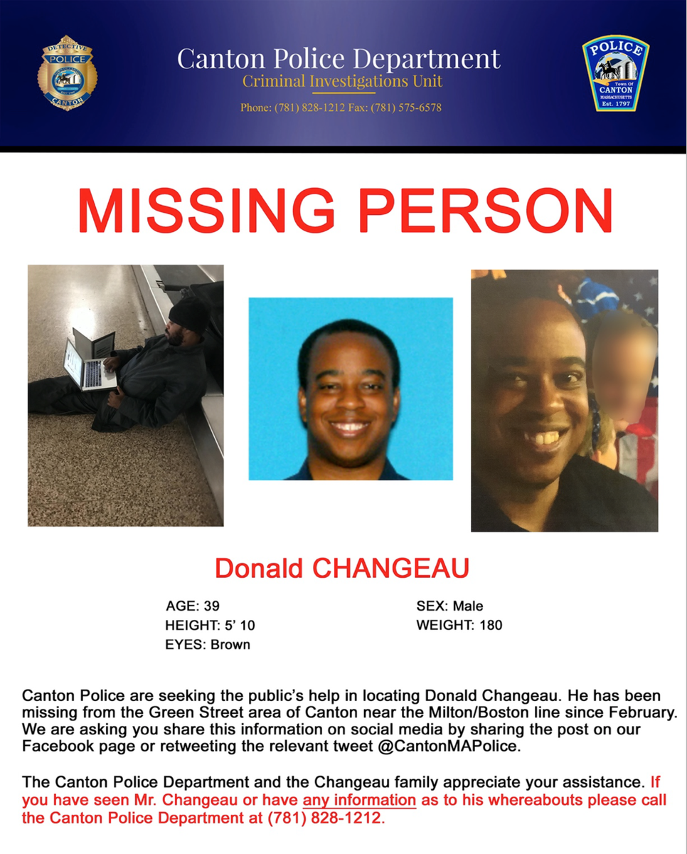 PLEASE RT: Missing from the Green St area of Canton near the Milton/Boston line is Donald CHANGEAU. He was last seen in February and we need the publi...