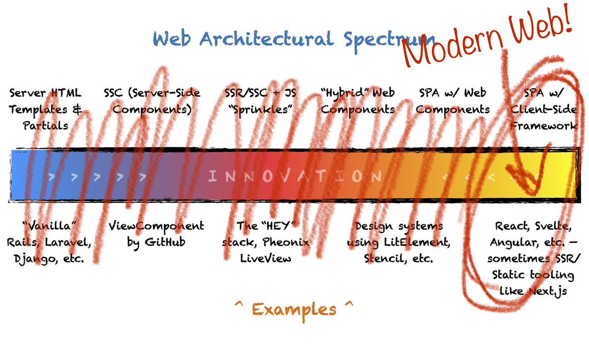 Instead of fruitless SSR vs. SPA debates, it's helpful to think of Web Architecture as a spectrum, with many hybrid states between the two poles.