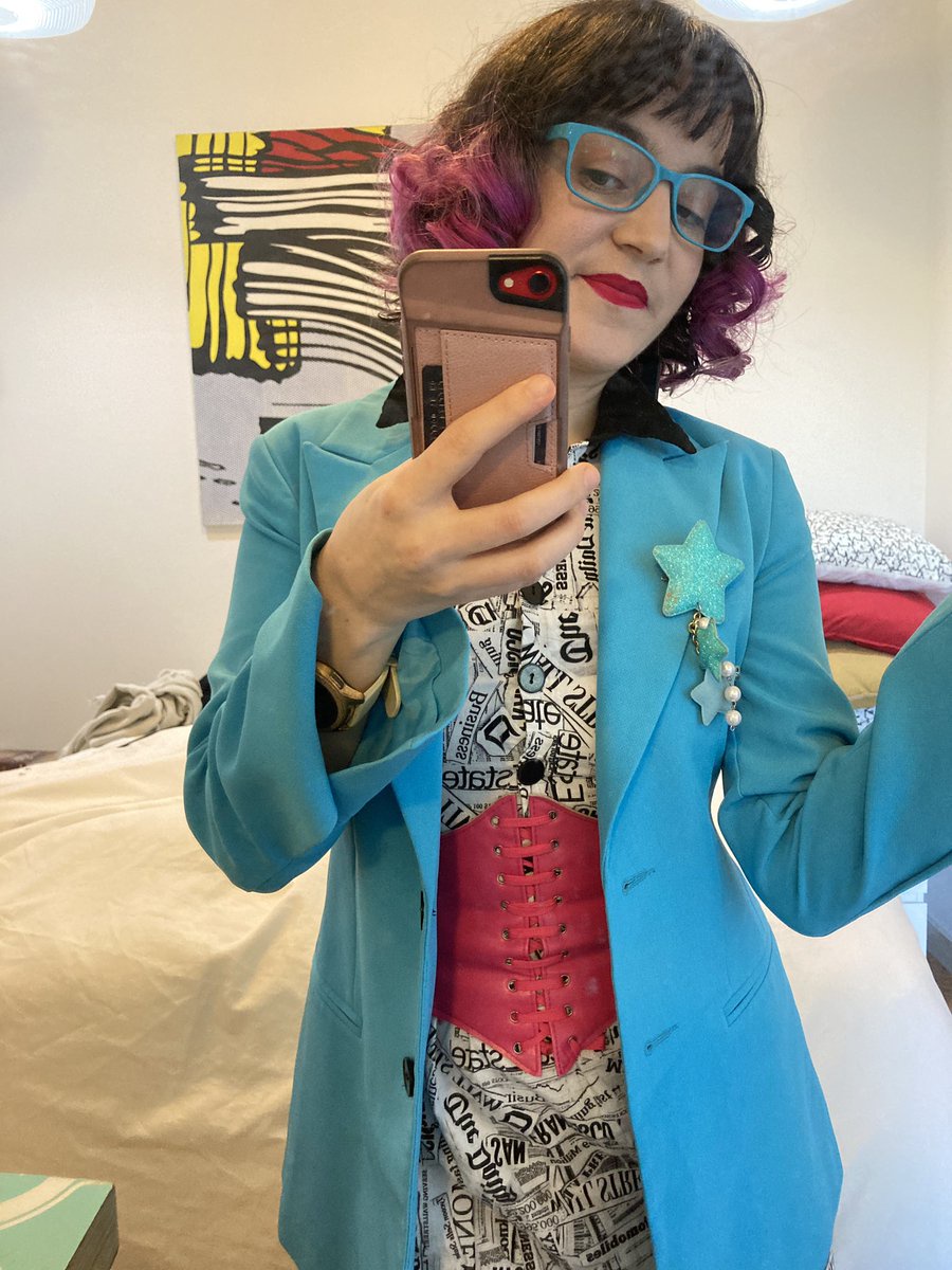 "text": "Is this outfit \u201ctoo much\u201d for a livestream billed as Bowie inspired? (It is way too hot to go full goblin king today)"