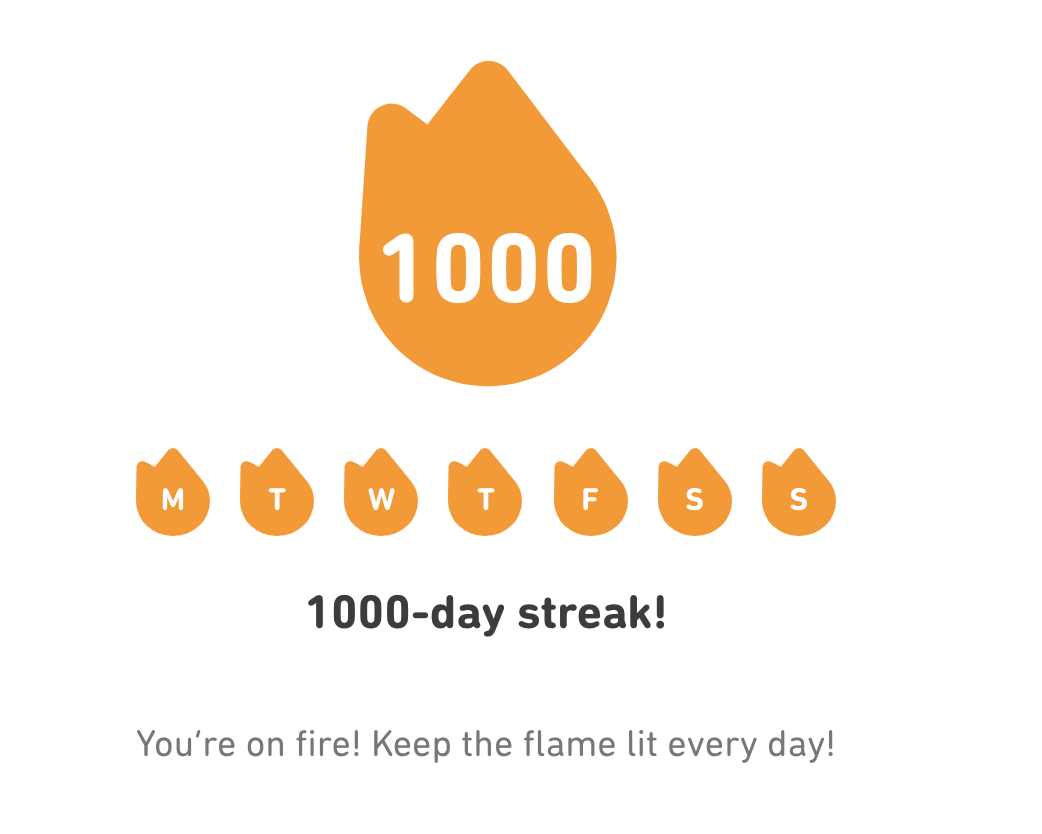 Today is the first time I've hit a 4-figure streak on @duolingo and I'm unreasonably proud of myself. (I have lost several 500+ day streaks.)