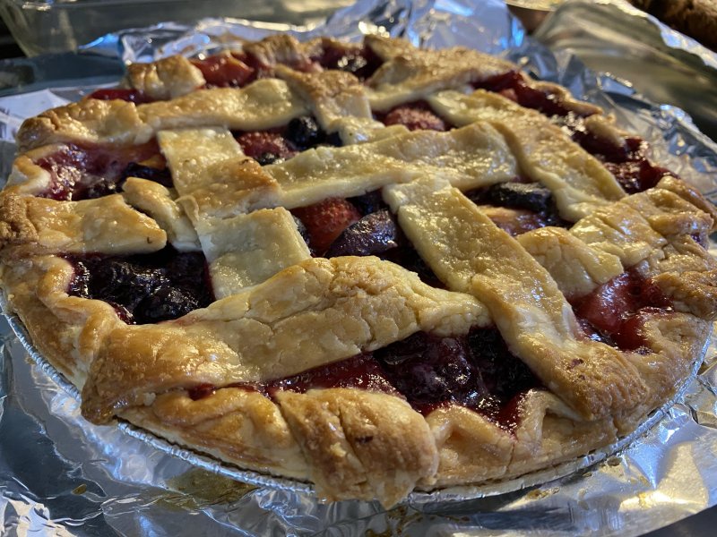 "text": "Had a bunch of fruit to use so I baked a pie. Blackberries, blueberries, plums, strawberries, apples, and black cherries. Smells good! Hopefully it tastes good :)"