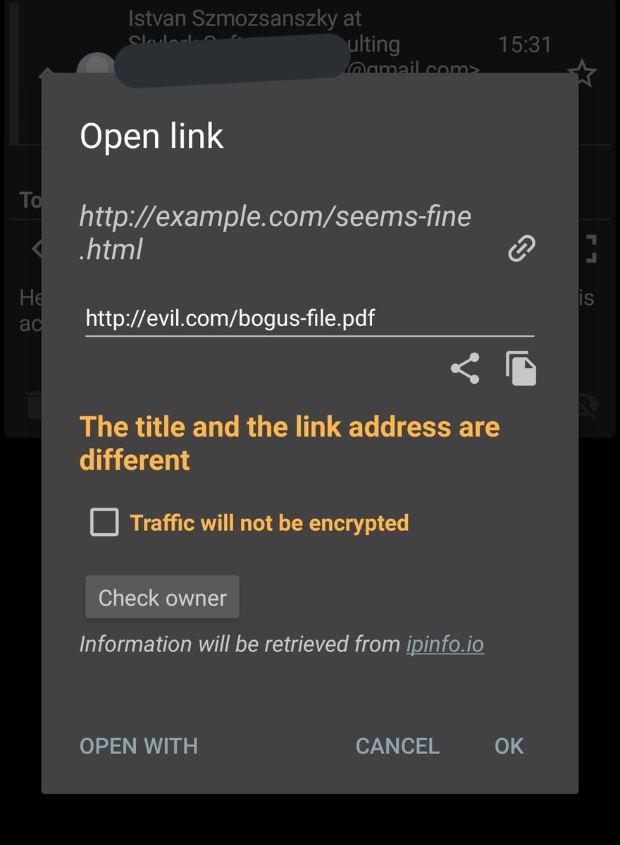 "text": "As part of anti-tracking measures, browsers and email clients should warn when a hyperlink's text looks like / parses as a URL, but its target points to a different address.\n\n...I wonder how hard it would be to create a Firefox or Thunderbird extension to that effect."