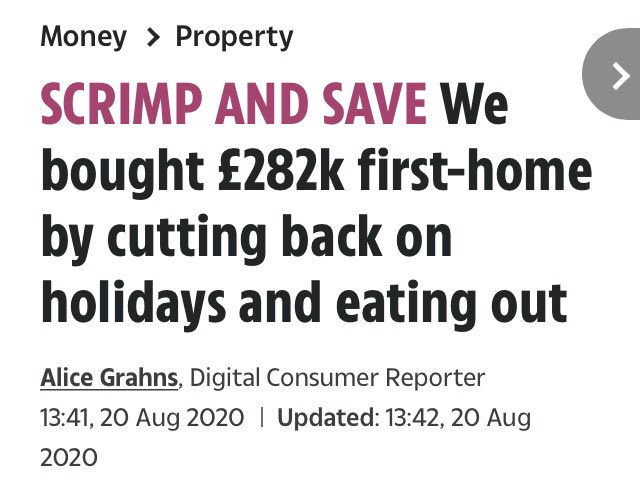 "text": "My favorite part of this is they saved ~\u00a336k by moving in with mum for two years \u2014 good job, now it's merely \u00a3240k to go until you can afford that \u00a3282k house. \ud83d\udc4f"