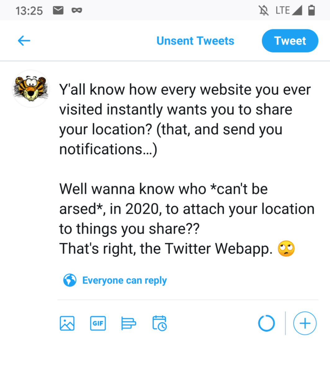 "text": "Y'all know how every website you ever visited instantly wants you to share your location? (that, and send you notifications\u2026)\n\nWell wanna know who *can't be arsed*, in 2020, to attach your location to things you share??\nThat's right, the Twitter Webapp. \ud83d\ude44"