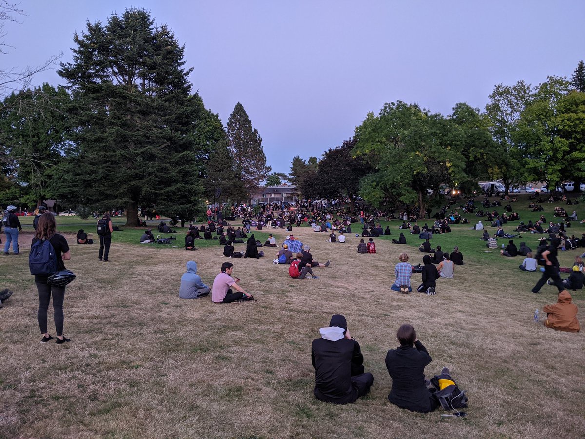 "text": "Another push and so much tear gas. I think the filter is saturated. Fuck\n\nThe crowd splits 3 ways. Police pause at 119th and Stark"