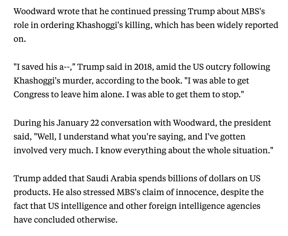 "text": "Trump on MBS after Khashoggi's murder, according to Woodward\u2019s book: \u201cI saved his ass. I was able to get Congress to leave him alone. I was able to get them to stop.\u201d businessinsider.com/trump-woodward\u2026",