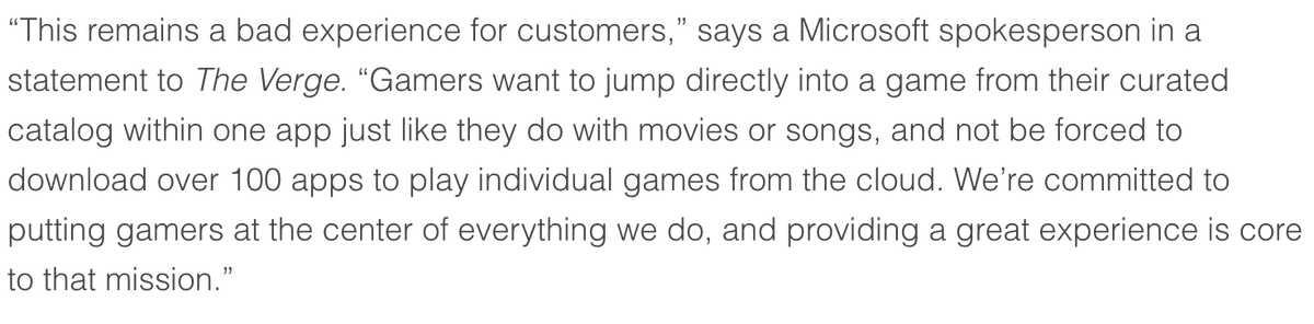 "html": "Microsoft is not interested in Apple\u2019s spiky tunnel loophole\n\n<a href=\"https://www.theverge.com/2020/9/11/21433071/microsoft-apple-app-store-rules-xcloud-game-streaming-xbox-game-pass\">theverge.com/2020/9/11/2143\u2026</a>"
