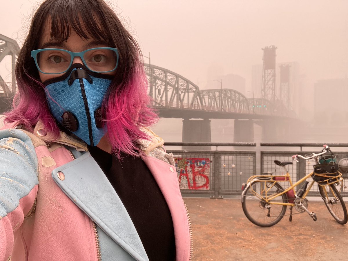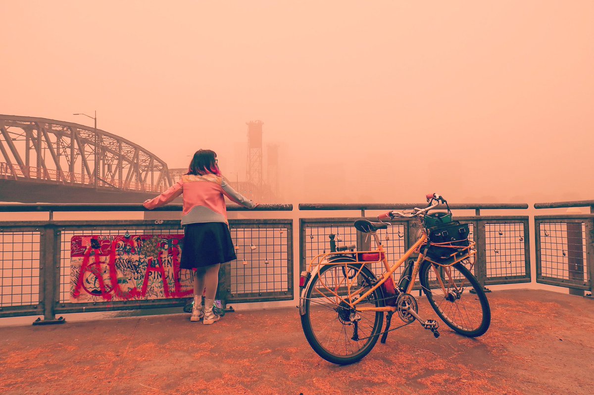 "text": "Went on a bike ride down to the waterfront today. The air isn't all that much worse outside than inside this point especially with an N95 mask, so thought it'd be a fun adventure. \n\nThis photo is not desaturated, this is what it actually looks like in Portland right now.",