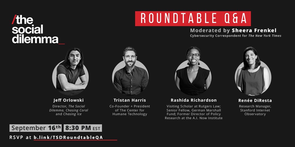 Now is the time to talk about how we can realign technology w/the interests of humanity. Join on 9/16 at 8:30 PM EST for a Q&A feat. the filmmakers & select subjects from #TheSocialDilemma. Moderated by @sheeraf, Cybersecurity Correspondent for @nytimes https://t.co/ZKvS84EB2q. pic.twitter.com/qT01duscoL