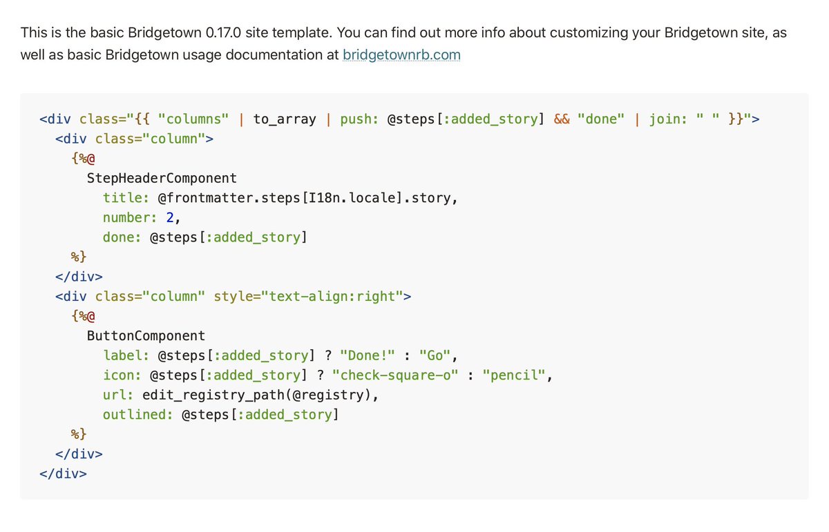 "text": "It would be pretty silly if you could use the new Ruby template engine I\u2019m building for @bridgetownrb but not blog any code examples with working syntax highlighting. So I added a new lexer for the Rouge gem. \ud83e\udd13\ud83d\udc4d\n\n(example below extracted from a Rails app\u2026)",